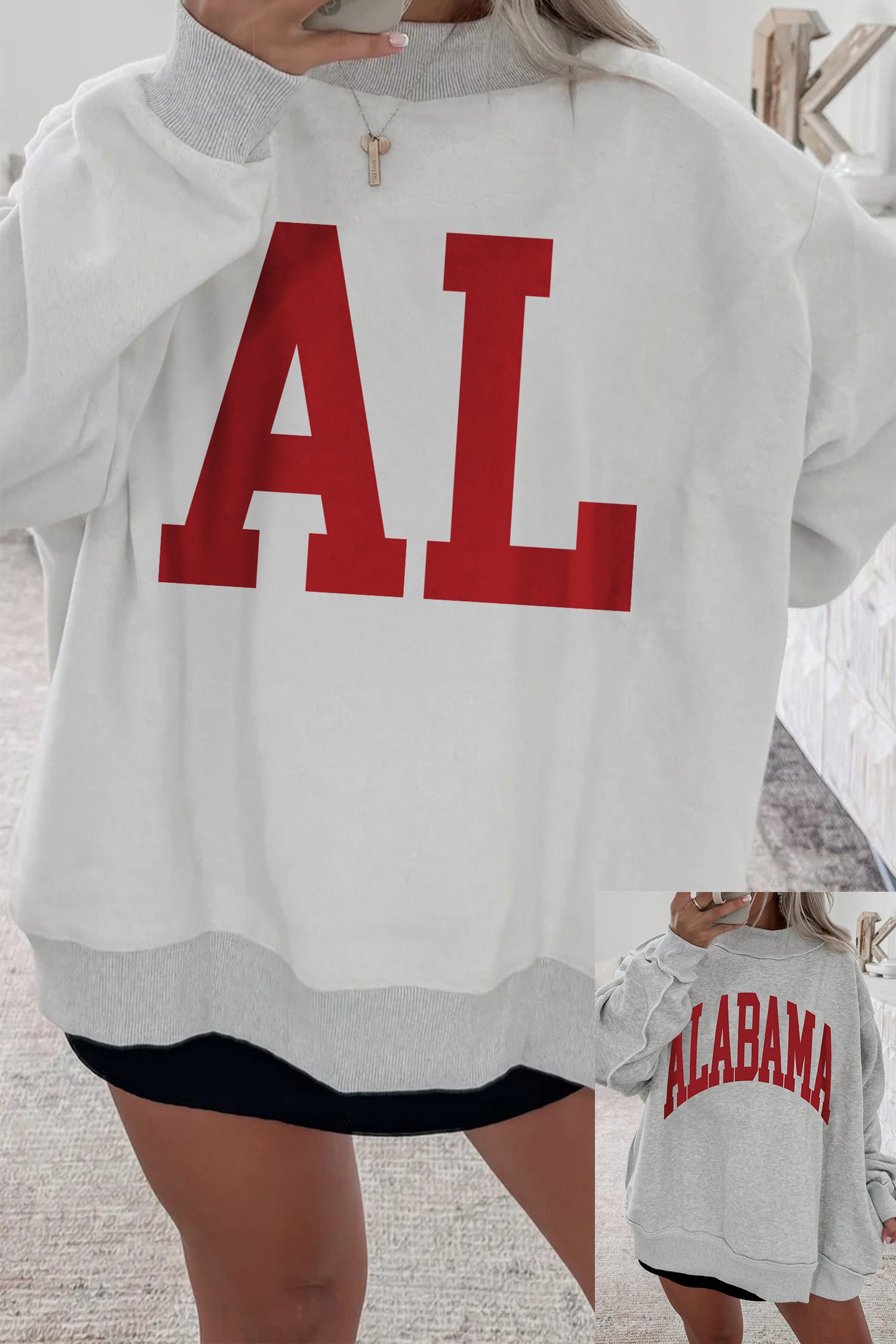 Show your team spirit in style with this graphic sweatshirt.. This versatile sweatshirt offers two looks with reversible prints.. It shows AL or ALABAMA in style by wearing it inside out. The oversize sweatshirt has a mock neck and dropped shoulders.